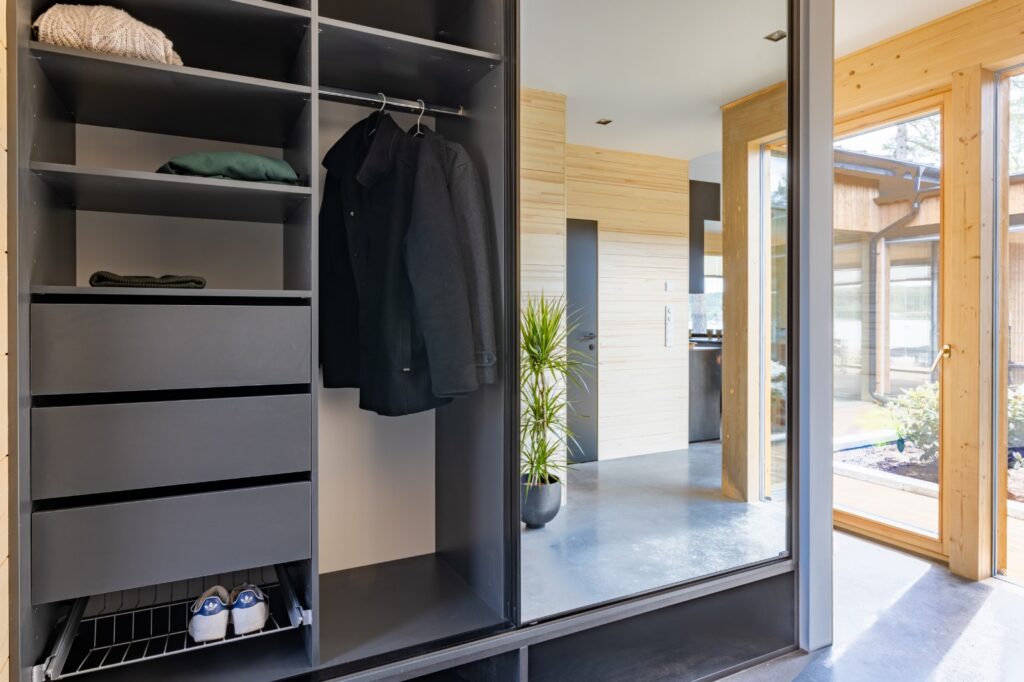 Tuotteemme valmistetaan aina mittatilaustyönä millimetrin välein niin syvyyden, korkeuden kuin leveydenkin osalta. Oli tarpeissasi sitten eteisen liukuovikaappi, vaatekaappi, vaatehuone tai muu säilytysjärjestelmä – me toteutamme sen ammattitaidolla. Tilasi mittojen mukaan suunnitellessa saadaan hyötykäyttöön jopa ahtaat tuulikaapit ja yläkerran vinokattoiset ullakot. Säilytysratkaisusi voi piilottaa sisälleen esimerkiksi kodinhoitohuoneen koneet – ja sen surullisen kuuluisan kaaoksen. Ongelmia eivät aiheuta myöskään pistorasiat, lattialistat, sähkökaapit tai vesiputket: kokonaisuutesi suunnitellaan vaikka näiden kaikkien ympärille.