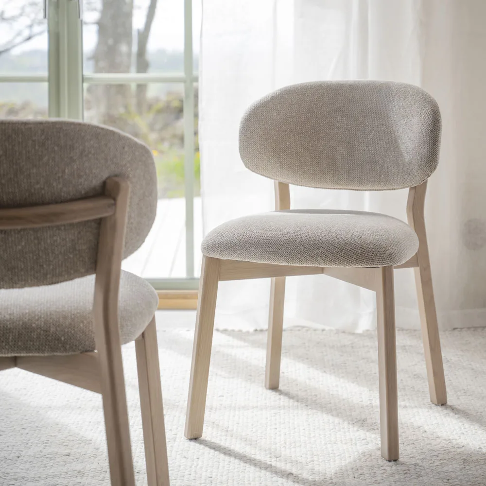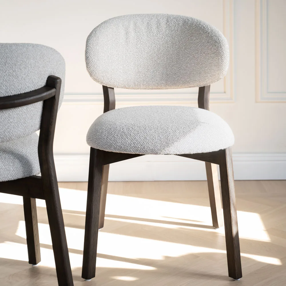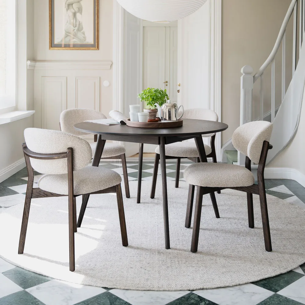 Runsaasti pehmustettu istuin ja selkänoja tarjoavat tukevan ja miellyttävän istumakokemuksen myös pidempiin ruokailuhetkiin. Verhoilukangas on hieman karkeampaa, eläväpintaista kudosta, joka tuo tuoliin modernia ilmettä ja luonnetta.