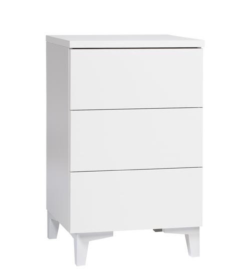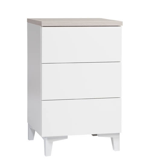 Materiaali: Runko, sokkeli ja kansi MFC-kalustelevyä, joka on ympäristöystävällinen materiaali ja jonka kulutuksenkesto ja värinpitävyys ovat erinomaiset. Laatikot ja ovet valkoiseksi maalattua MDF -levyä.
