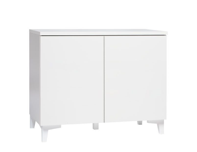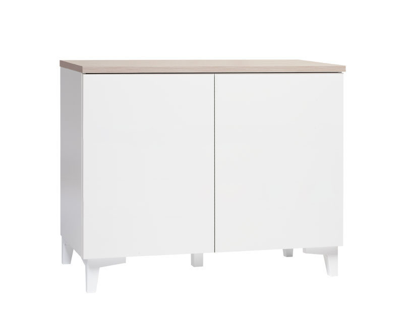 Materiaali: Runko, sokkeli ja kansi MFC-kalustelevyä, joka on ympäristöystävällinen materiaali ja jonka kulutuksenkesto ja värinpitävyys ovat erinomaiset. Laatikot ja ovet valkoiseksi maalattua MDF -levyä.