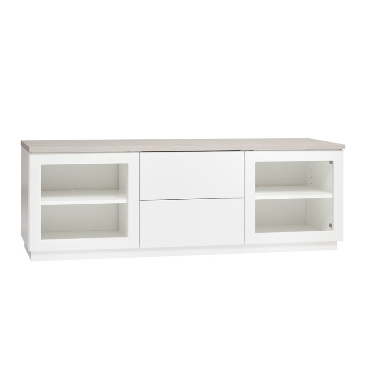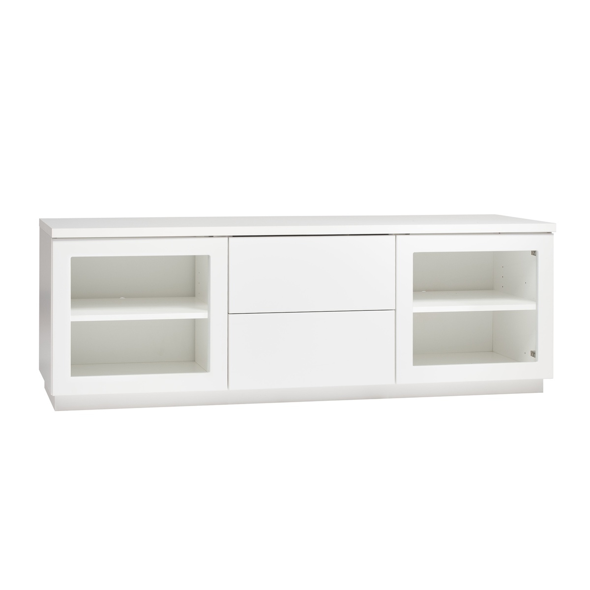 tv-taso kahdella lasiovella ja kahdella laatikolla, jotka aukeavat laadukkailla push open mekanismeilla. Sisällä kaksi hyllyä.