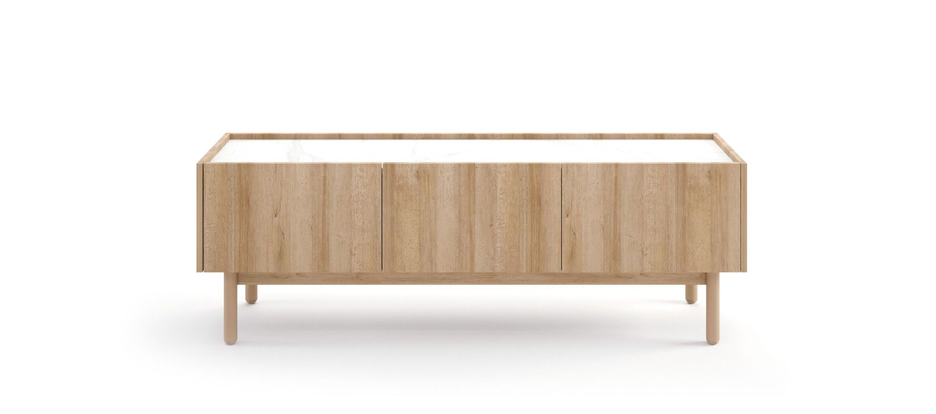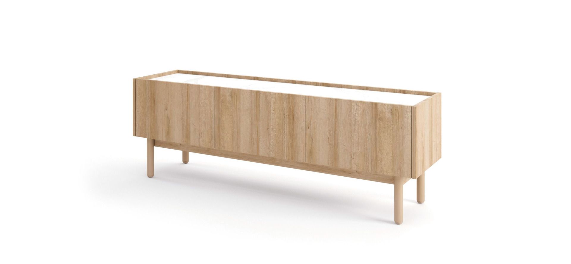 Tyylikäs tammen värinen Bohox tv-taso, jonka kaunis kansi on valkoista marmorijäljitelmälevyä.