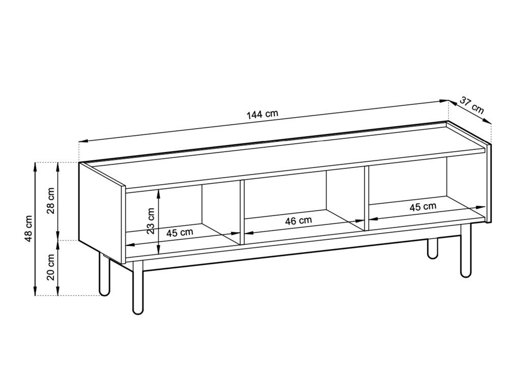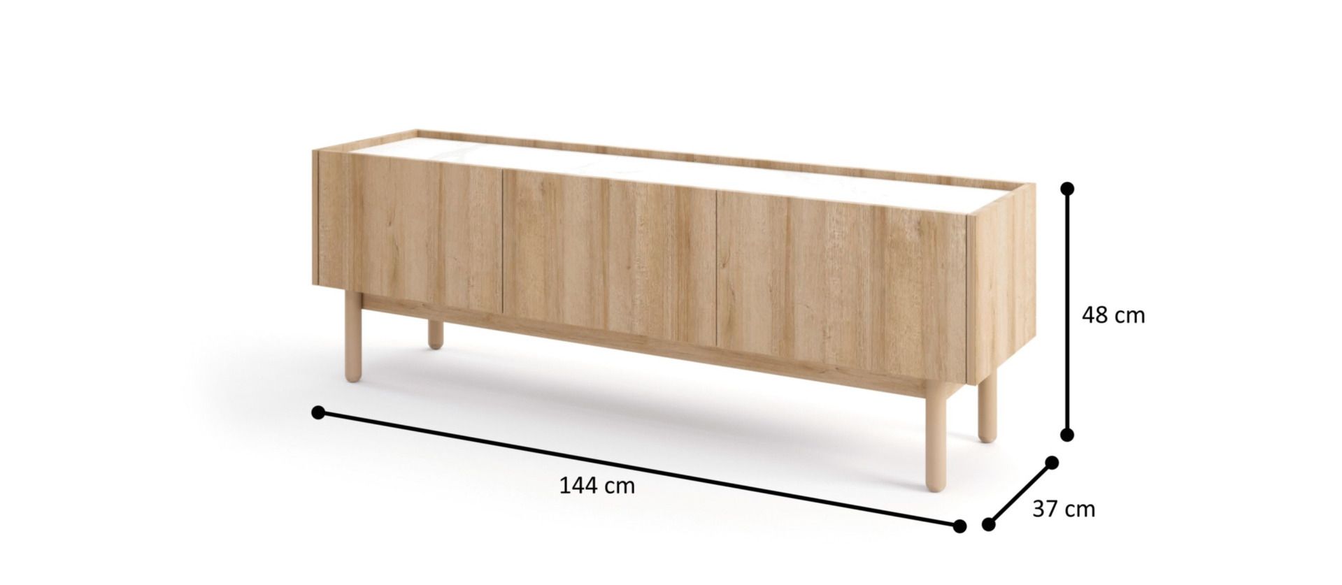 Tyylikäs tammen värinen Bohox tv-taso, jonka kaunis valkoinen kansi on marmorijäljitelmälevyä. Tv-tasossa on 16 mm laminoitu kalustelevyrunko, ABS-reunanauha sekä jalat puuta. Tv-taso sisältää kolme kippiovellista kaappia. Tv-tason leveys on 144 cm, syvyys 37 cm ja korkeus 48 cm. Kantavuus 30 kg. Toimitus osina.