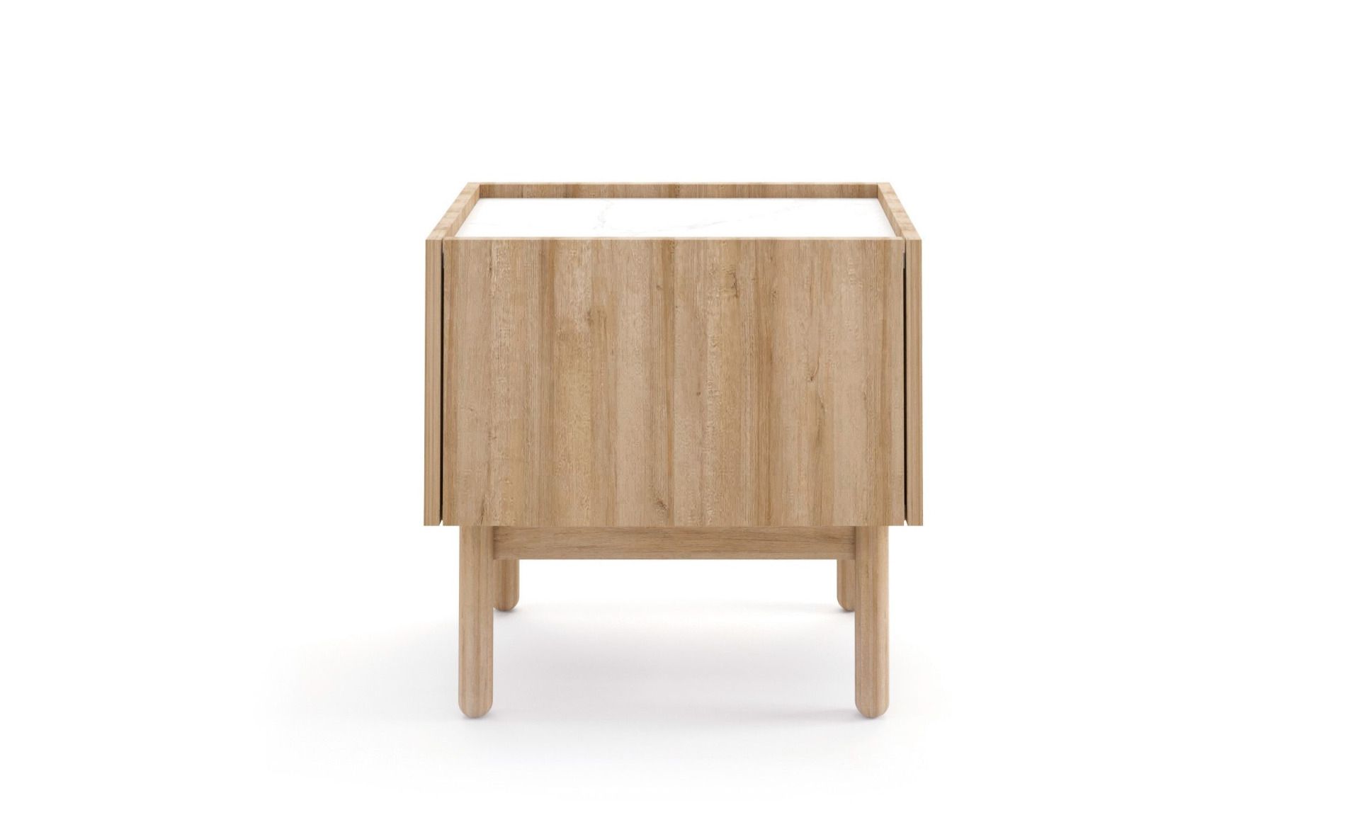 Tyylikäs tammen värinen Bohox-yöpöytä, jonka kaunis kansi on valkoista marmorijäljitelmälevyä.