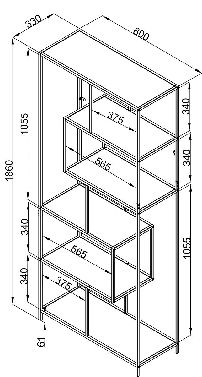 Siro, suoralinjainen Dawson-hylly, jossa on pulverimaalattu musta metallirunko ja tammen väriset mdf-hyllyt. Hyllyn leveys on 80 cm, syvyys 33 cm ja korkeus 186 cm. Hyllyjen kantavuus on 20 kg. Toimitus osina.