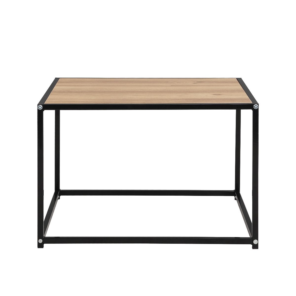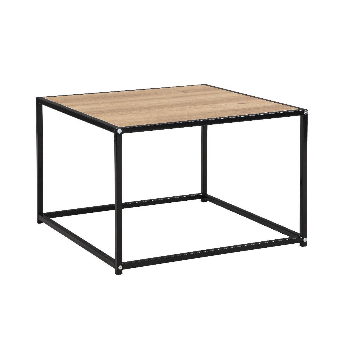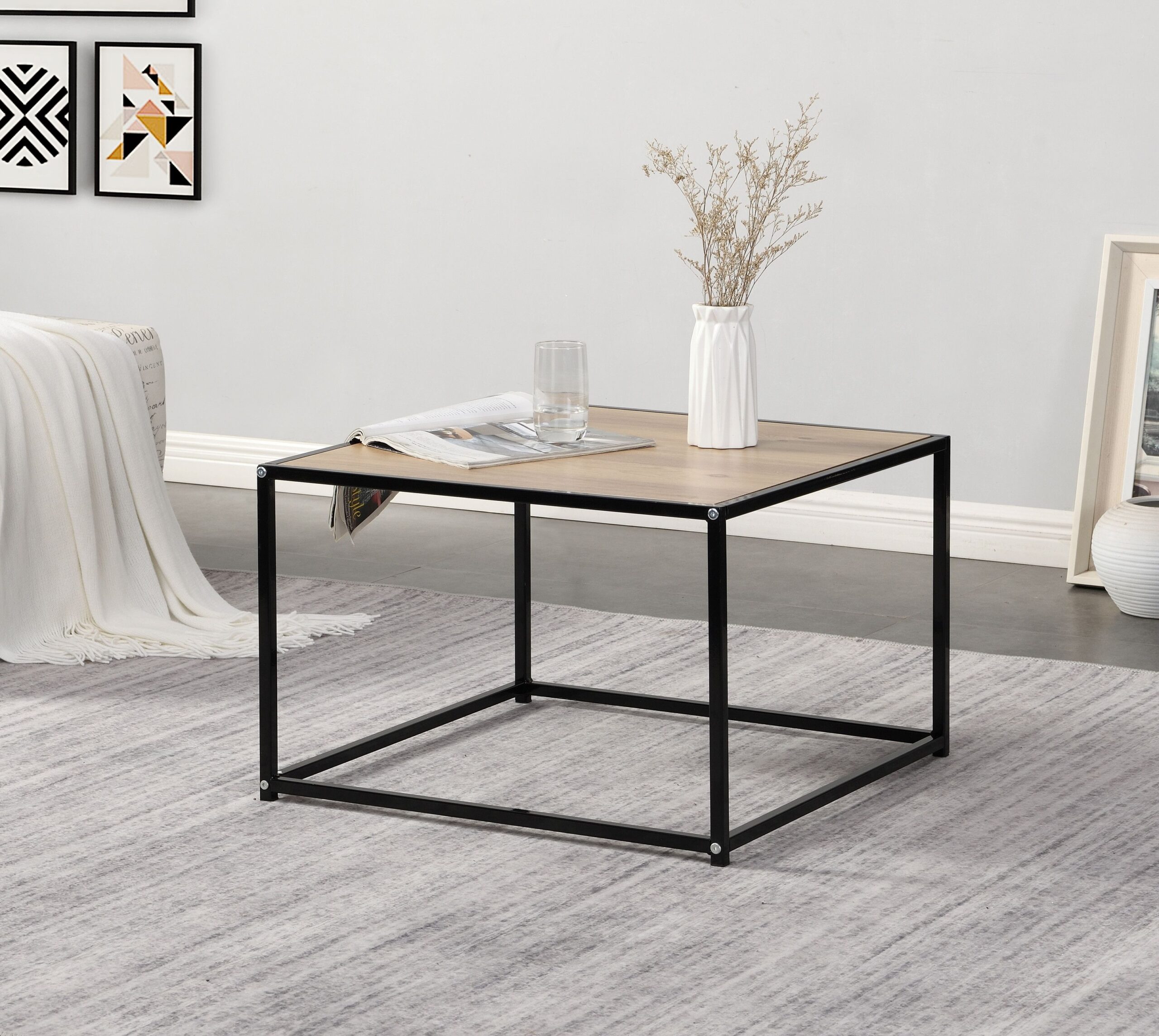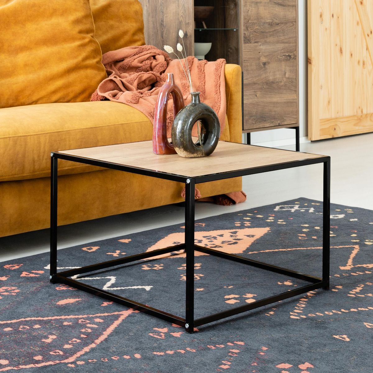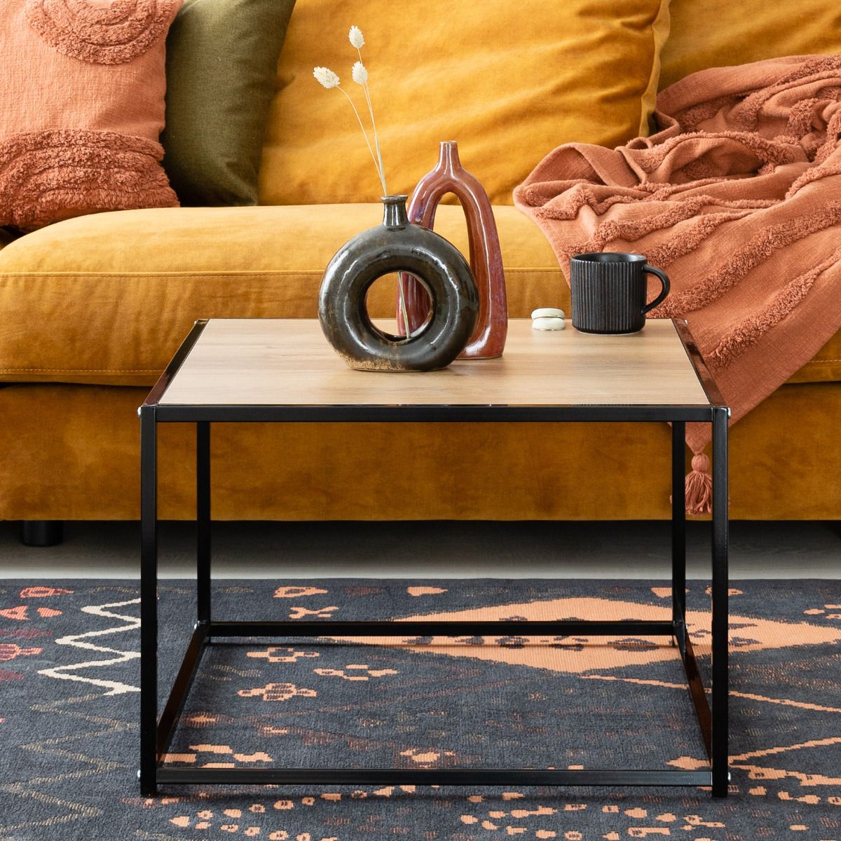 Siro ja tyylikäs Dawson-sohvapöytä, jossa on pulverimaalattu musta metallirunko ja tammen värinen pinnoitettu mdf-kansi.