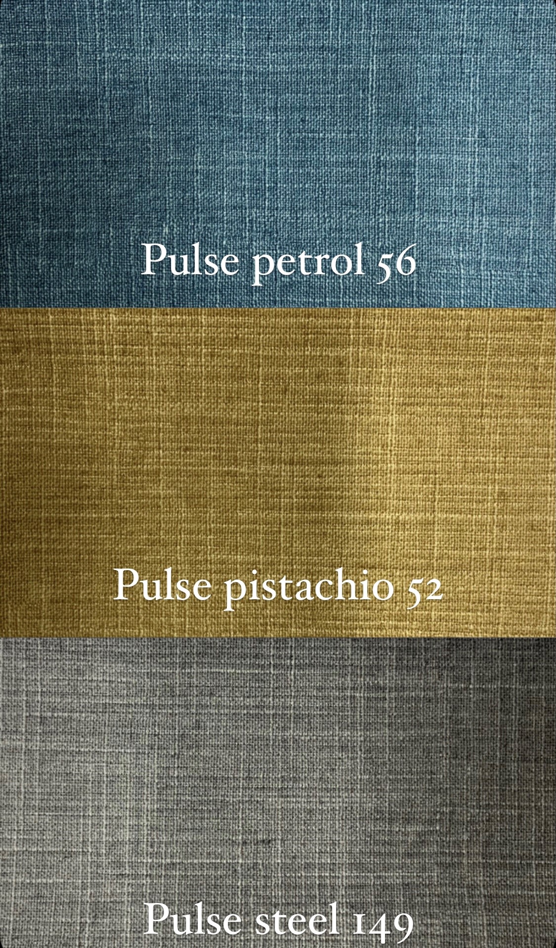 | Kangas | Pulse Steel 149, Pulse Pistachio 52, Pulse Petrol 56, Page Taupe 12, Page Anthracite 67, Page Ashgrey 40 |