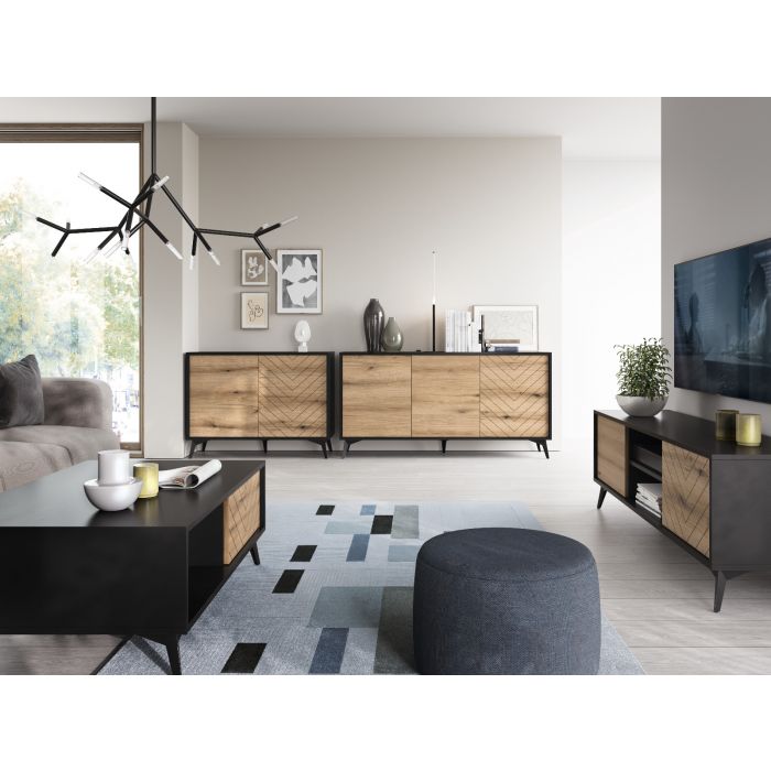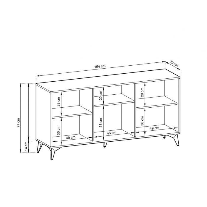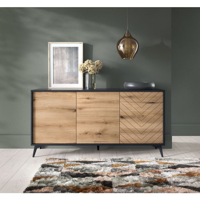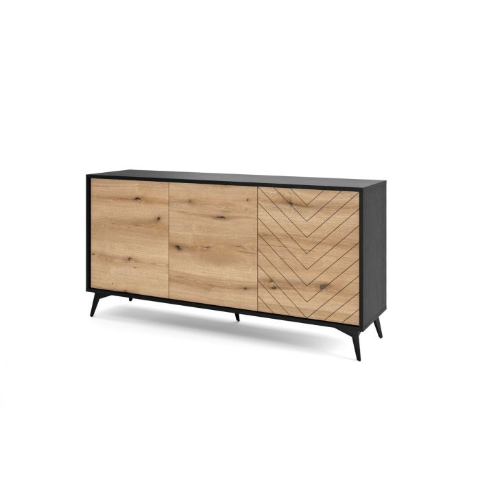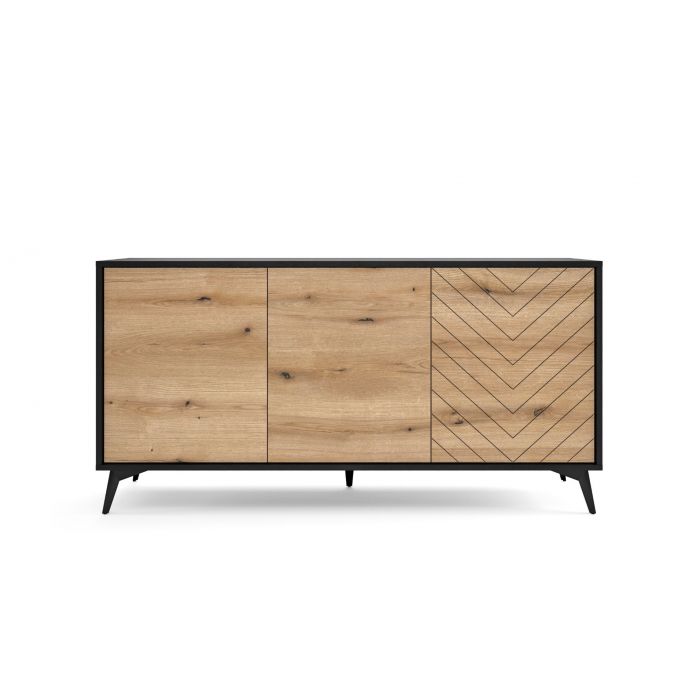 Tyylikäs ja näyttävä Dumont-senkki, josta löytyy kolme tilavaa kaappia. Jokaisessa kaapissa on välihylly. Senkissä on 16 mm laminoitu kalustelevyrunko, ABS-reunanauha sekä mustat metallijalat. Kaapien ovissa on tammen väriset etusarjat sekä oikeanpuoleisessa ovessa kaunis koristeellinen kuvio. Ovissa push-to-open –mekanismi. Senkin leveys on 153,5 cm, syvyys 39 cm ja korkeus 76,5 cm. Toimitus osina.