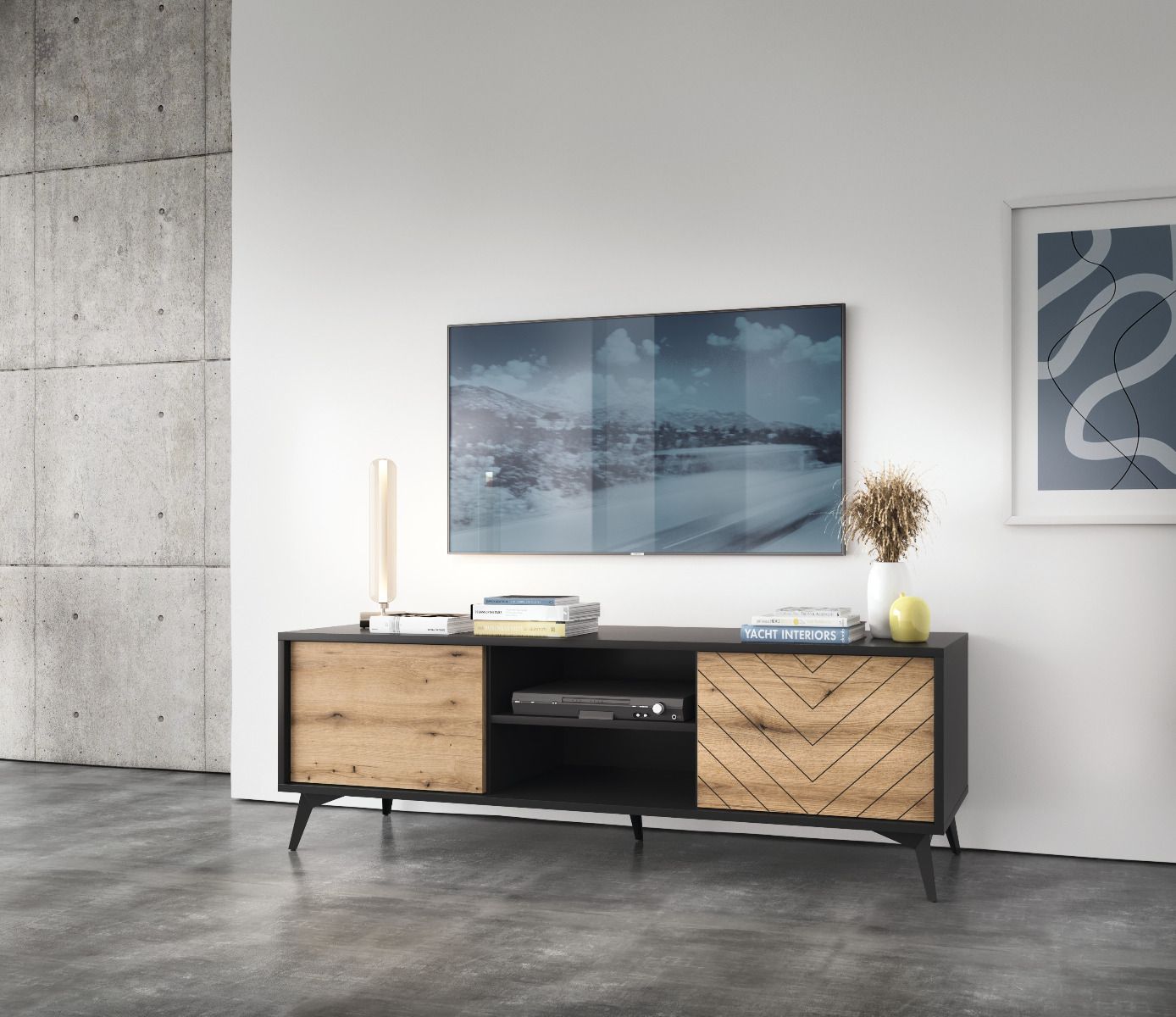 Tyylikäs ja näyttävä Dumont tv-taso, josta löytyy avohyllyt sekä kaksi kaappia.