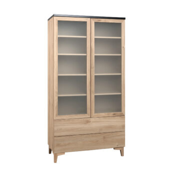 Tyylikäs ja näyttävä Dumont-vitriini. Vitriinissä on ylhäällä karkaistu lasiovi ja sen takana kaksi lasihyllyä. Alhaalla olevan kaapin sisällä on välihylly. Vitriinissä on 16 mm laminoitu kalustelevyrunko, ABS-reunanauha sekä mustat metallijalat. Vitriinin ovissa on tammen väriset etusarjat sekä kaunis koristeellinen kuvio. Ovissa push-to-open –mekanismi. Vitriinin leveys on 53,5 cm, syvyys 39 cm ja korkeus 178 cm. Toimitus osina.