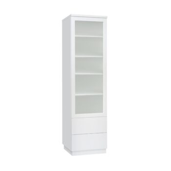Tyylikäs ja näyttävä Dumont-vitriini. Vitriinissä on ylhäällä karkaistu lasiovi ja sen takana kaksi lasihyllyä. Alhaalla olevan kaapin sisällä on välihylly.