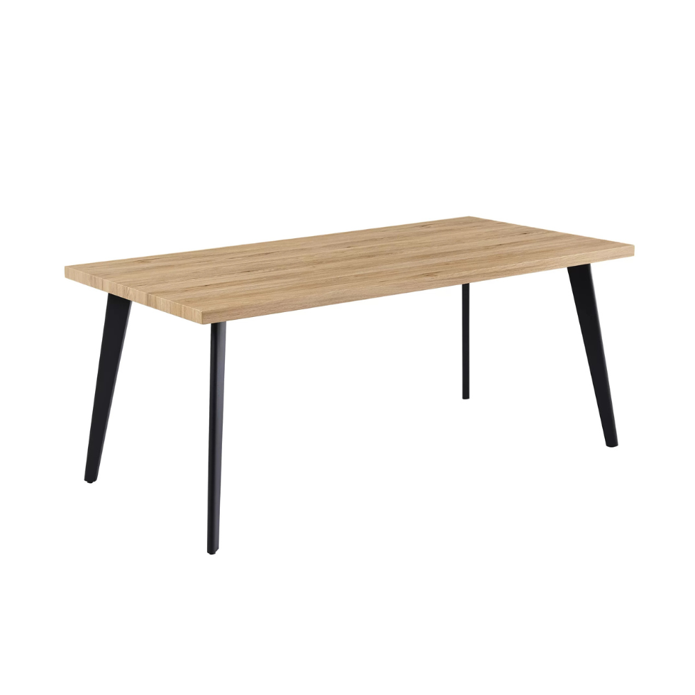 Näyttävä East ruokapöytä, paksulla 40mm MDF-kannella. Pinnassa on helppohoitoinen ja kaunis puujäljitelmäkuviointi. Tukevat jalat ovat mustaksi maalattua metallia. Pöydän ympärille mahtuu mukavasti 6 tuolia.