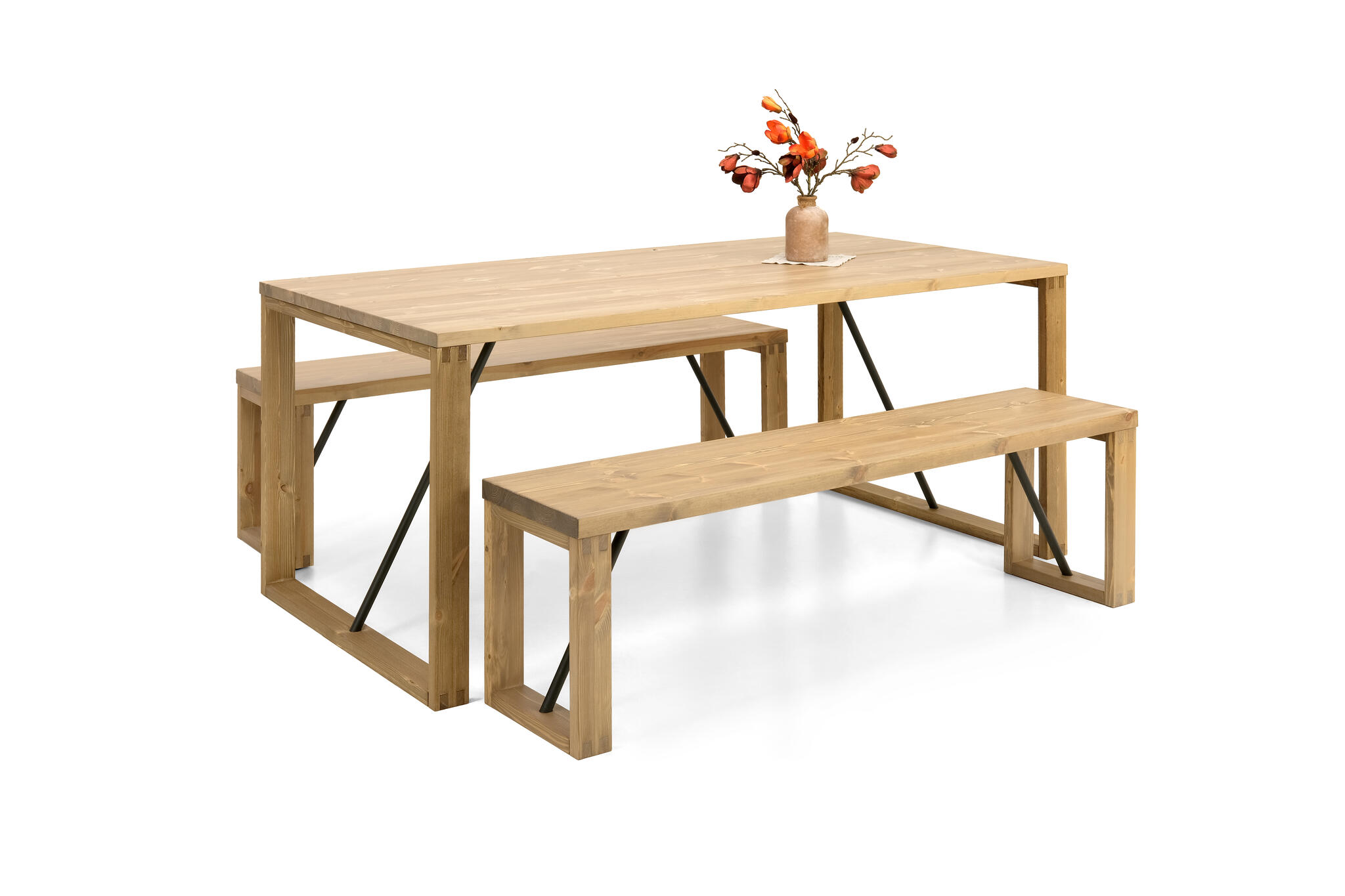 Edna-ruokapöytä tuo rustiikkista charmia kotiisi tai terassillesi. Se sopii täydellisesti niin sisä- kuin ulkokäyttöön, tarjoten käytännöllisyyttä ilman kompromisseja tyylissä. Massiivimäntyinen kansi on huolellisesti viimeistelty, ja sen kauniit puunsyykuviot tuovat jokaisen pöydän ainutlaatuisuuden esiin. Tasaiset reunat ja tyylikkäät värivaihtoehdot – antiikki, harmaa ja musta – tekevät pöydästä näyttävän lisän mihin tahansa tilaan.