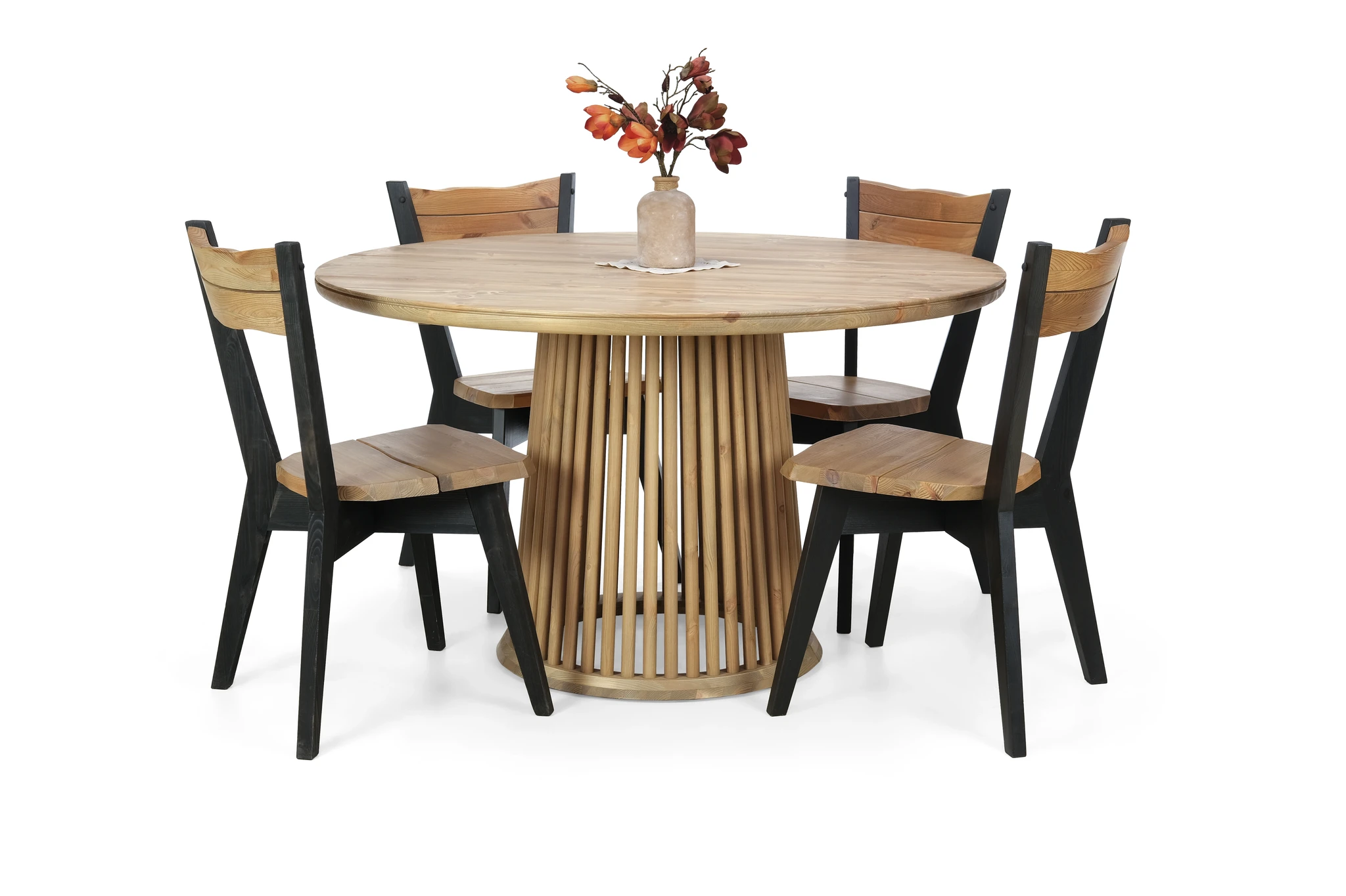 Rustikkinen viimeistely tekee jokaisesta pöydästä yksilöllisen – pinnassa voi esiintyä luonnollisia halkeamia, oksanreikiä ja epätasaisuuksia, jotka lisäävät pöydän luonnetta ja aitoutta.