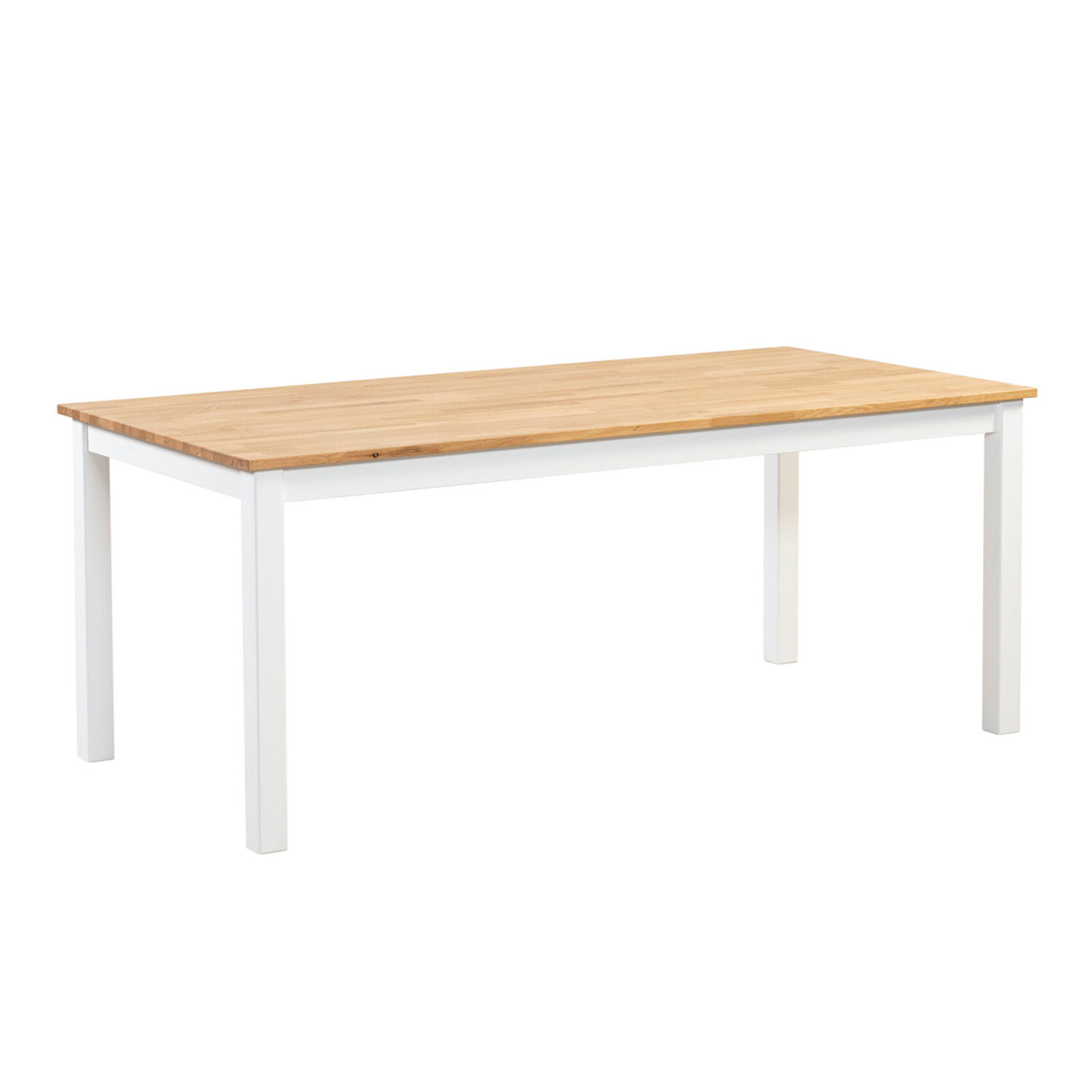 Tyylikäs ja tukeva tammikantinen ruokapöytä kuudelle hengelle. Kansi tammea, jalat maalattua koivua.