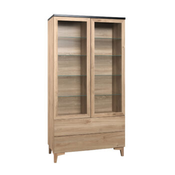 Kotimainen Fondi vitriini tarjoaa runsaasti säilytystilaa ja kauniin tavan tuoda esineitäsi esille. Leveä ja korkea mitoitus tekee siitä näyttävän katseenvangitsijan, joka sopii yhtä hyvin ruokailutilaan, olohuoneeseen kuin työhuoneeseenkin. Vitriinissä on kolme säädettävää hyllyä sekä kaksi tilavaa laatikkoa, joten säilytystilaa löytyy sekä näkyville, että piiloon asetettaville tavaroille. Ovet ovat saatavilla kolmella eri vaihtoehdolla – umpiovet, kirkkaat lasiovet tai maitolasiovet ja halutessaan vitriinin voi tilata myös ilman ovia. Yksinkertainen ja ajaton muotoilu tekee tästä vitriinistä pitkäikäisen ja monikäyttöisen osan kotisi sisustusta.