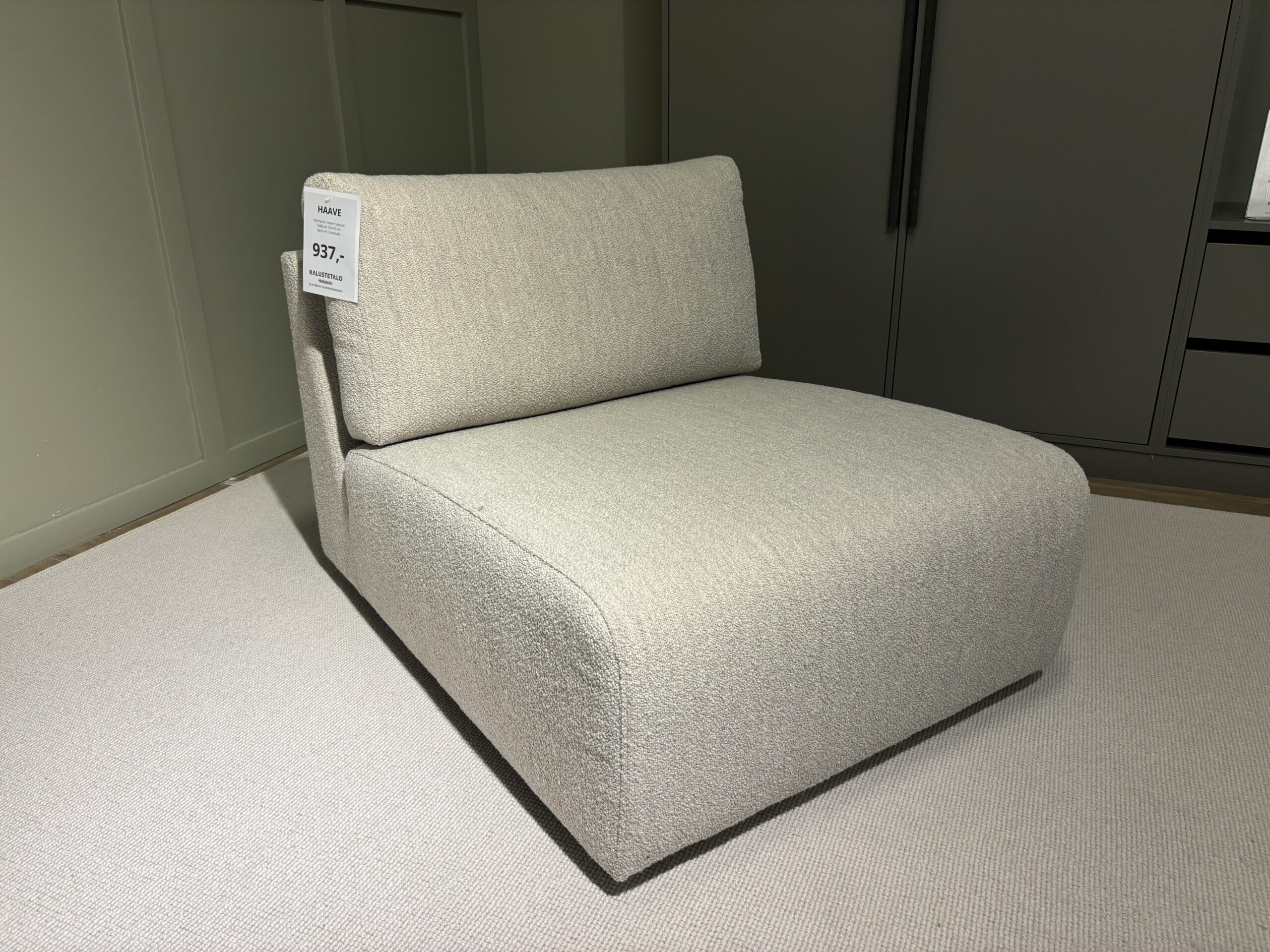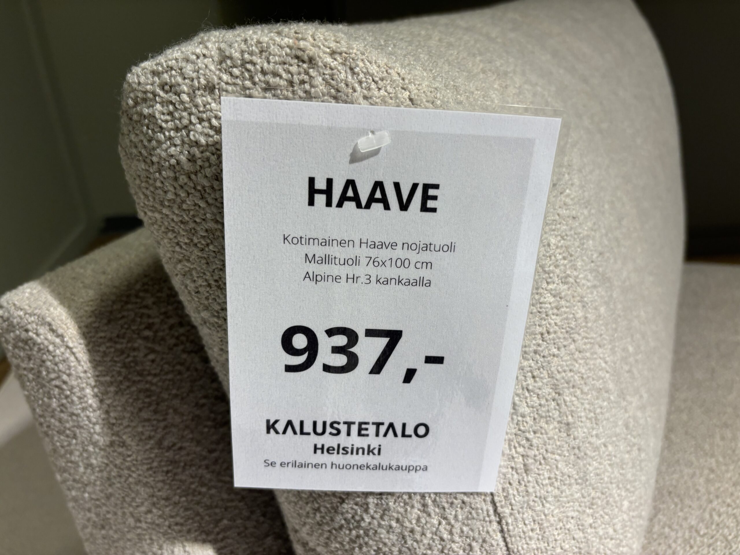 Kotimainen Haave nojatuoli, myymälämalli. Verhoiltu buklee kankaalla.