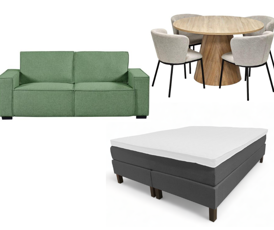 Paketti sisältää 3 istuttavan Bolt sohvan, Saana 120 pöydän, 4 Kaarlo tuolia ja 160x200cm Base jenkkisängyn