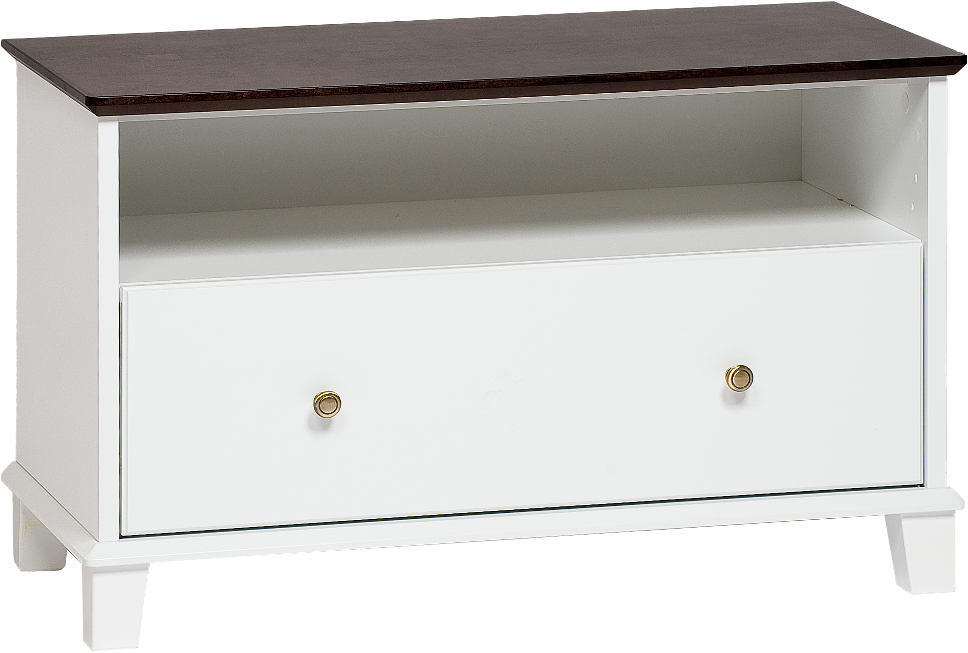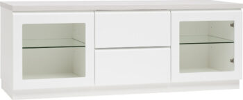 Klaara TV-taso on siro ja elegantti kaluste, joka sopii täydellisesti pienempiin tiloihin. Tasossa on yksi vetolaatikko ja avoin laitetila, jotka tarjoavat käytännöllistä säilytystilaa ja pitävät elektroniikan siististi järjestyksessä. Messingin väriset nuppivetimet ja valkoinen runko tuovat kalusteeseen klassista eleganssia, joka sopii monenlaiseen sisustustyyliin.