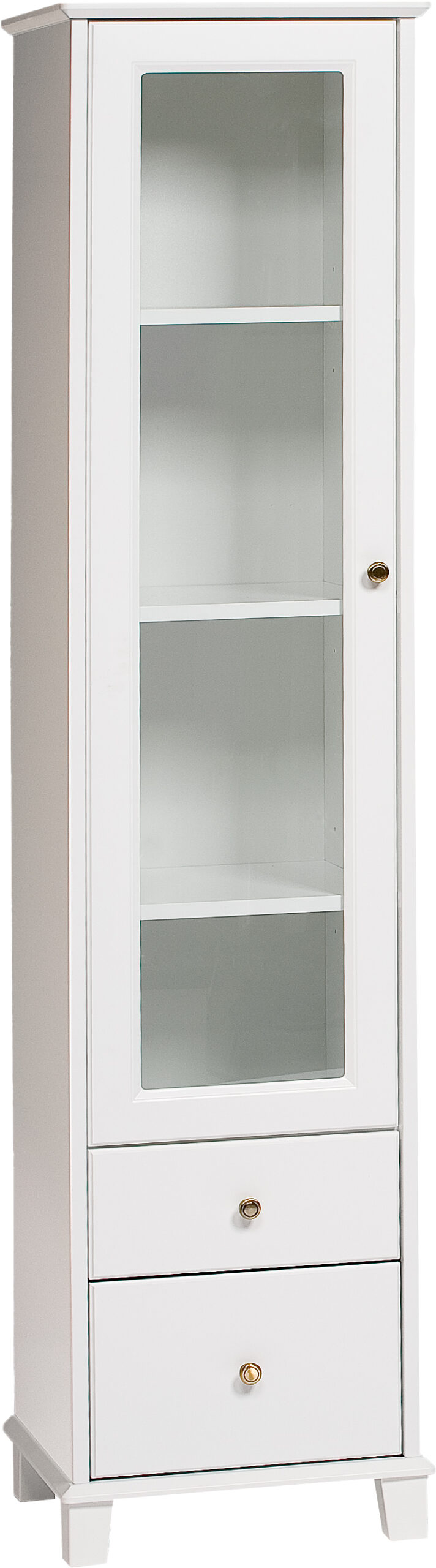 Klaara vitriini tuo sisustukseen perinteisen ilmeen hillityn tyylikkäästi. Selkeälinjainen muotoilu, kauniit viisteet ja messinginväriset nuppivetimet luovat ajattoman kokonaisuuden, joka sopii niin moderniin kuin klassiseenkin kotiin. Tämä kapea vitriini on erinomainen valinta pienempiin tiloihin. Kalusteessa on yksi lasiovi ja sen takana kolme hyllyä, joista ylin on säädettävä, sekä kaksi vetolaatikkoa kätevään pientavaroiden säilytykseen. Vitriini on saatavilla myös umpiovella kaappina tai avohyllynä ilman ovea.