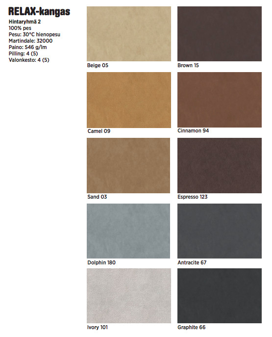 | Väri | Relax Anthracite 67, Relax Beige 05, Relax Brown 15, Relax Camel 09, Relax Cinnamon 94, Relax Cream 02, Relax Dolphin 180, Relax Espresso 123, Relax Graphite 66, Relax Ivory 101, Relax Sand 03, Relax Tan 119, Relax Tobacco 111 |