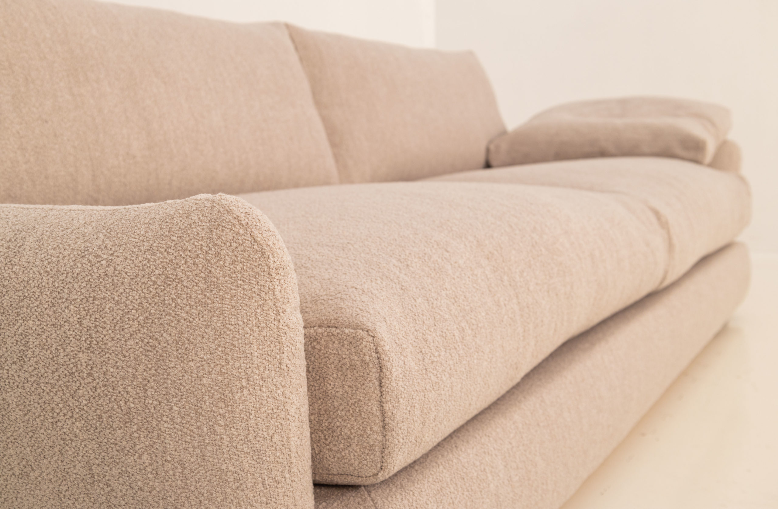 Kiintoverhoiltu runko, istuintyynyt yhdeltä puolelta verhoillut, selkätyynyt kaksinpuolin verhoiltuja