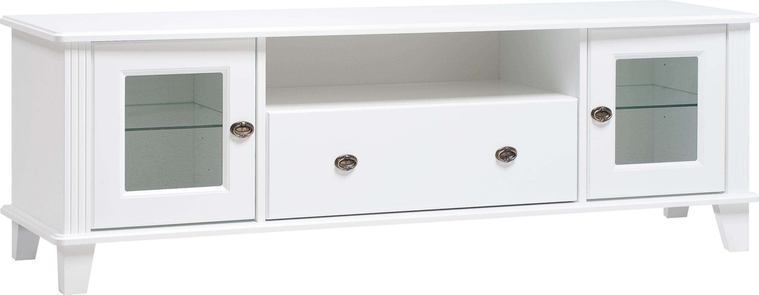 Rosa TV-taso on kaunis ja laadukas kotimainen kaluste, joka yhdistää maalaisromanttisen muotoilun ja toimivan käytännöllisyyden. Tasossa on kaksi lasiovellista kaappia, joissa on säädettävä lasihylly kummassakin, sekä tilava vetolaatikko keskellä. Täydellinen ratkaisu viihdelaitteiden ja tarvikkeiden säilytykseen tyylikkäässä kokonaisuudessa. Koristeelliset uritukset ja patinoidun hopean väriset rengasvetimet viimeistelevät Rosa-sarjan tunnistettavan, ajattoman ilmeen. Tämä tv-taso on yhtä aikaa elegantti ja käytännöllinen – se tuo olohuoneeseen rauhallista harmoniaa ja kestävää laatua vuosiksi eteenpäin.