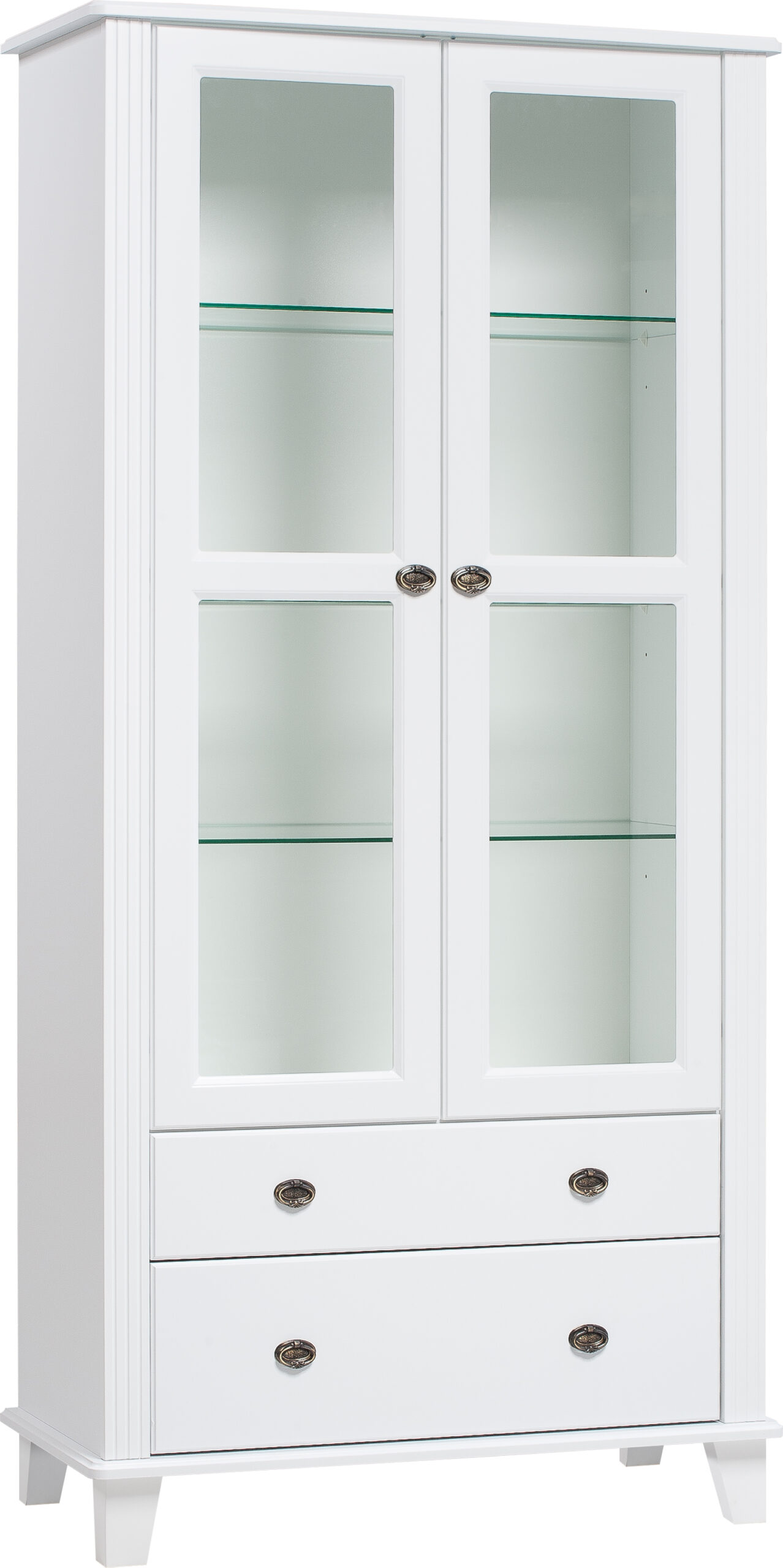 Rosa-vitriini on tyylikäs ja maalaisromanttinen kaluste, joka tuo kotiin valoisuutta ja klassista eleganssia. Vitriinissä on kaksi vetolaatikkoa ja kolme säädettävää lasihyllyä, jotka tarjoavat runsaasti tilaa astioiden, koriste-esineiden tai keräilyaarteiden esillepanoon. Koristeelliset uritukset ja patinoidun hopean väriset rengasvetimet viimeistelevät Rosa-sarjan tunnistettavan ilmeen – kaunis valinta keittiöön, ruokailutilaan tai olohuoneeseen.