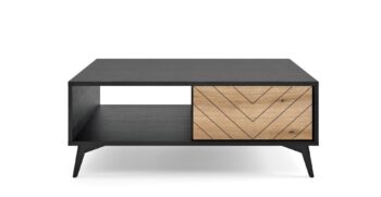 Sohvapöydän kansi on 100 % FSC-sertifioitua massiivipuuta ja pöydän jalat ovat mustaksi maalattua metallia.