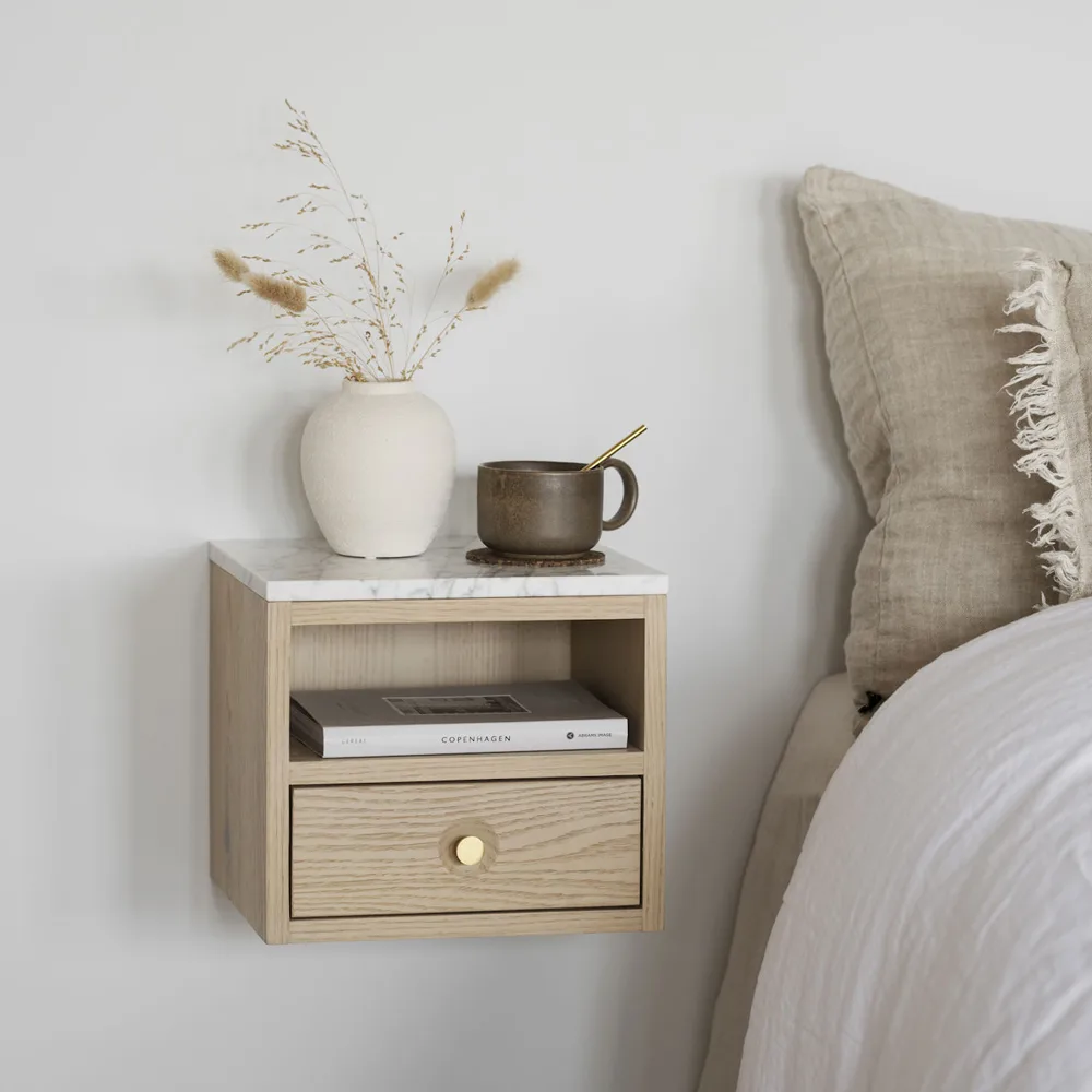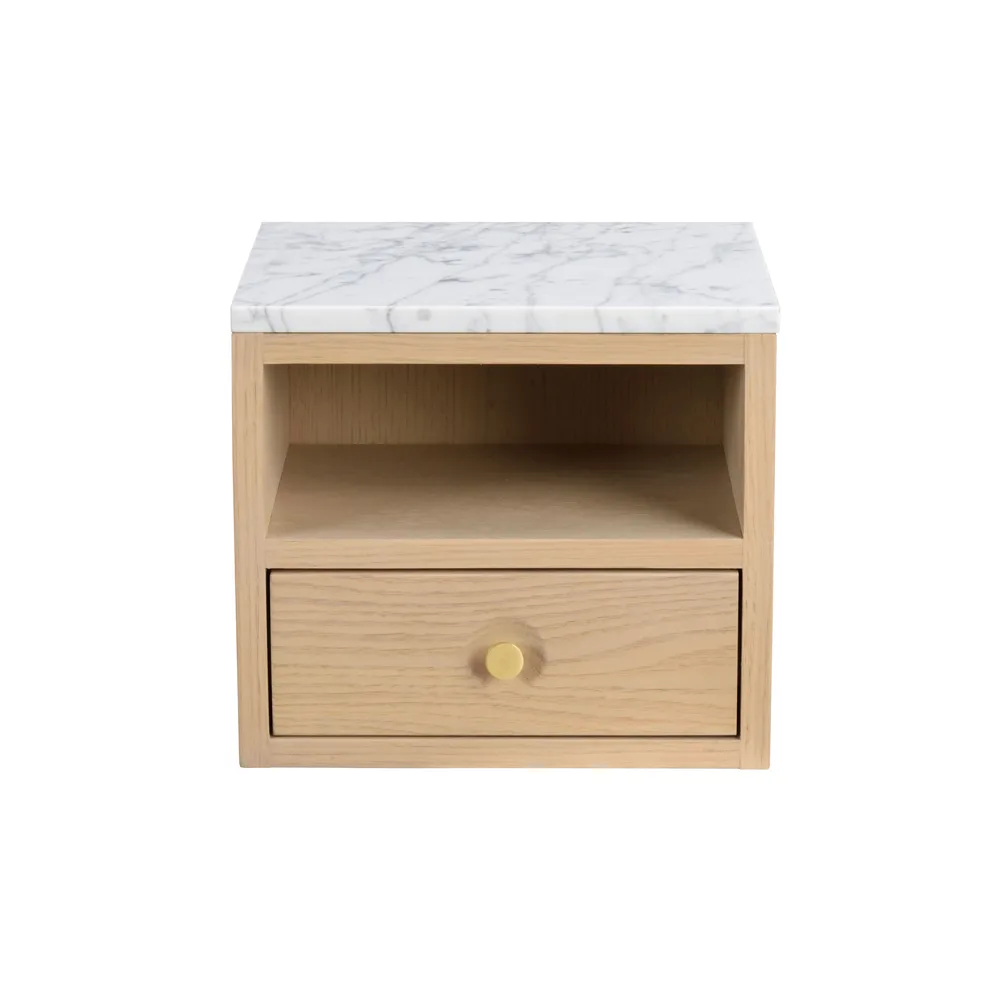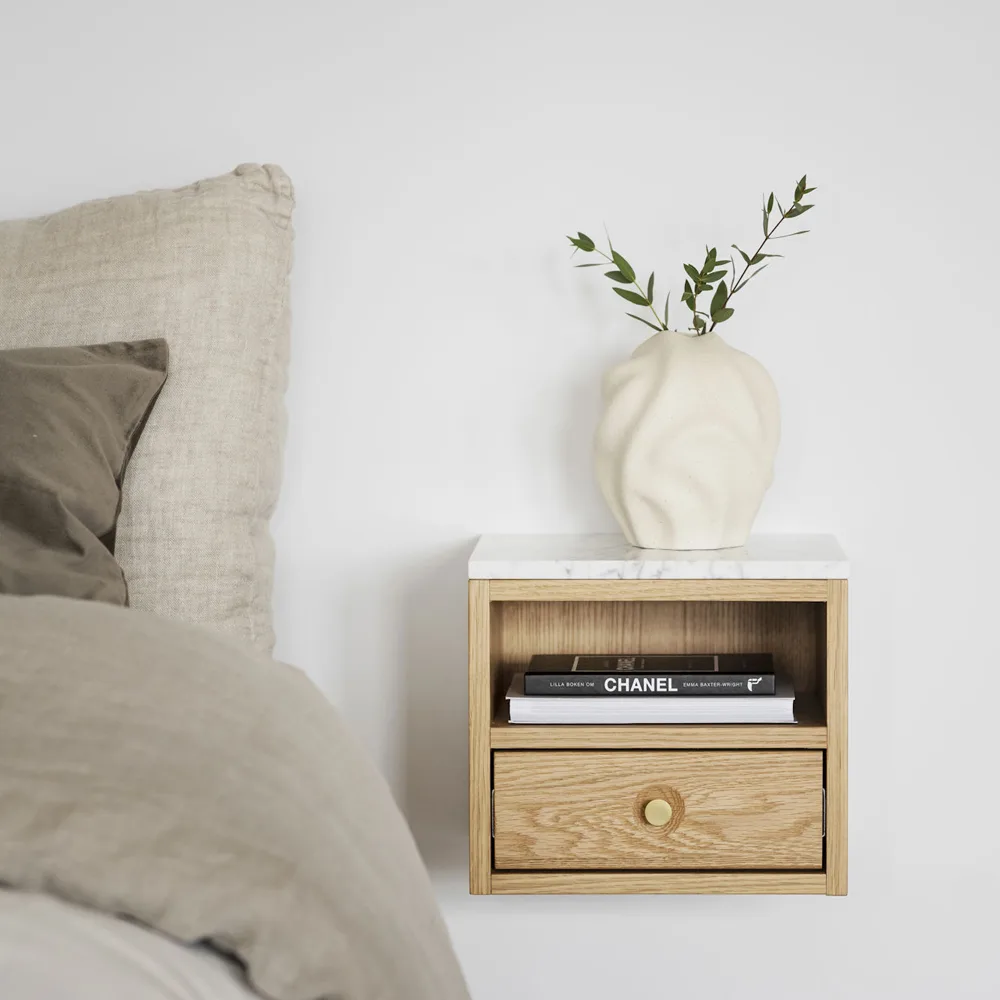 Yöpöytä on tilattavissa kahdessa värissä: tammi ja valkopesty tammi.