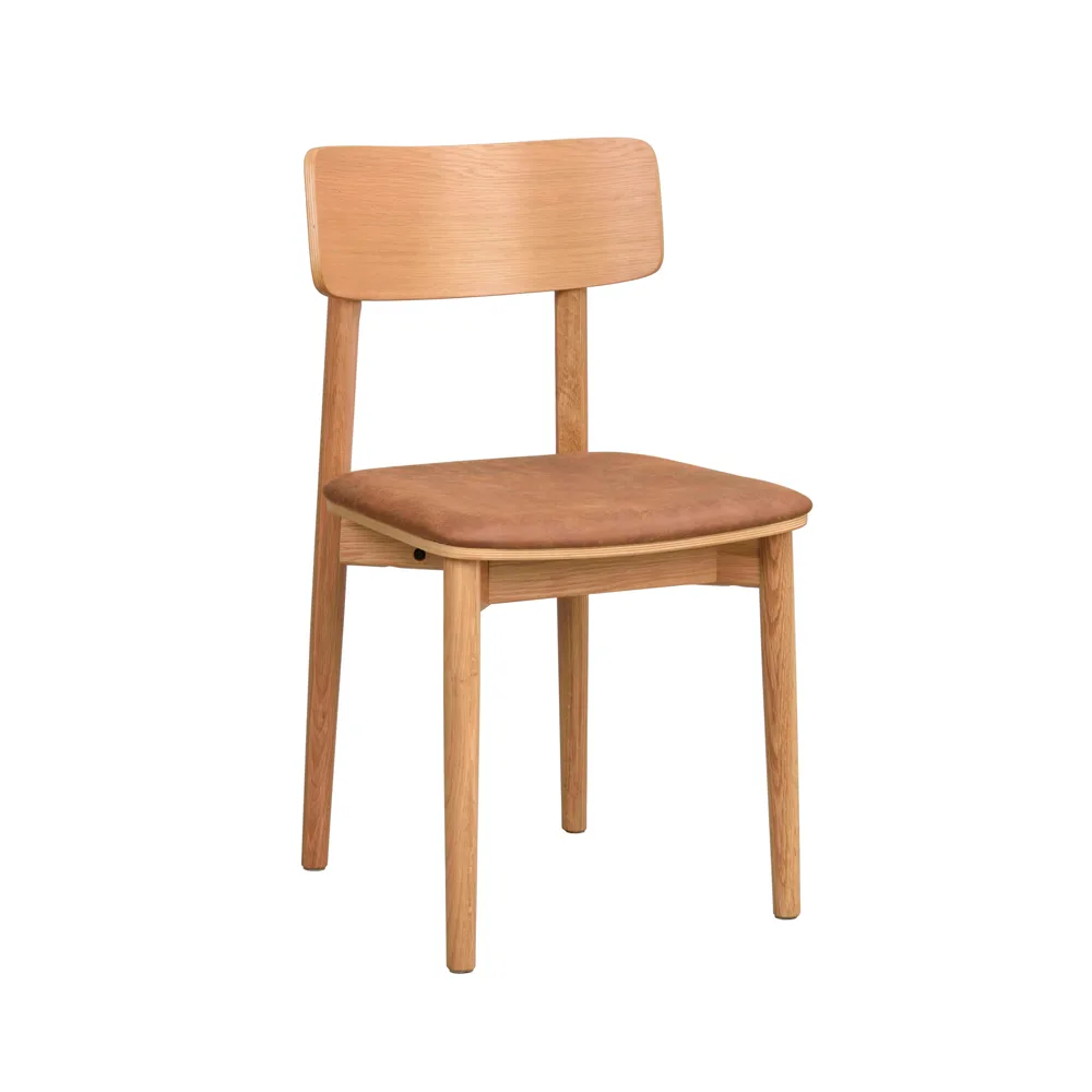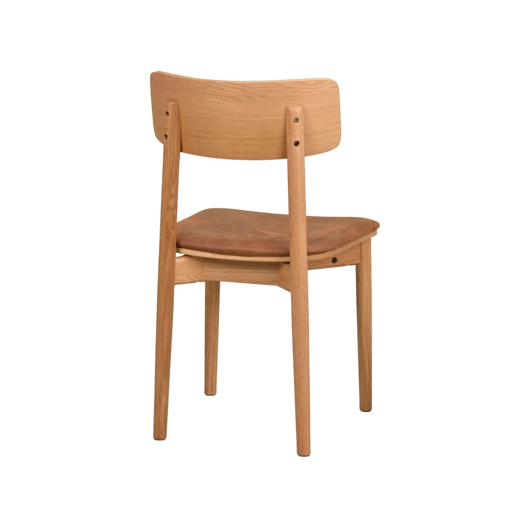 Tuolin istuin on verhoiltu kestävällä ruskealla verhoilukankaalla, joka on valmistettu kierrätetystä nahasta ja tekstiilistä. Tuolin runko ja jalat on valkolakattua FSC-sertifioitua massiivitammea. Selkänoja on tammiviilutettua koivuvaneria.