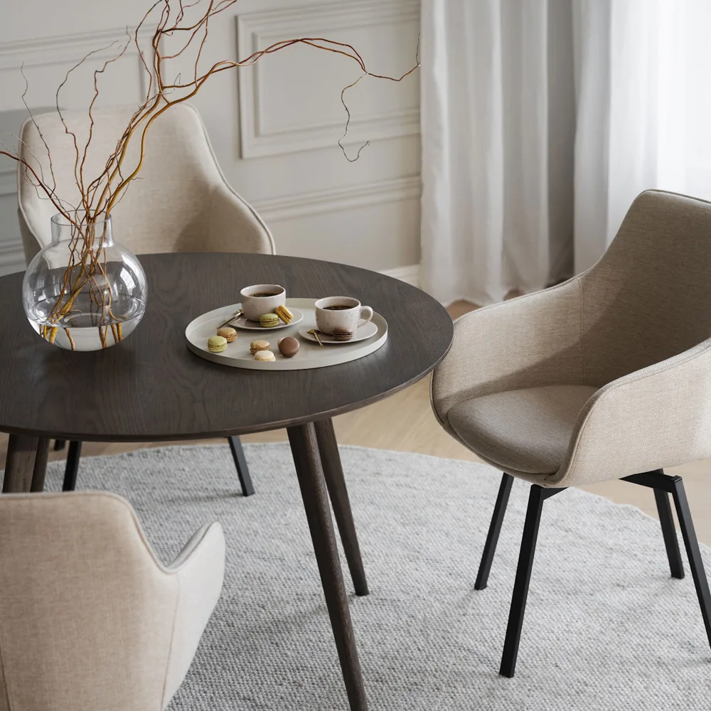 Halkaisijaltaan 115cm kokoinen Yumi-ruokapöytä mahtuu pienempäänkin tilaan. Pyöreän pöydän ympärillä seurustelu koko pöytäseurueen kanssa onnistuu vaivatta ja ruoat mahtuu hyvin kattamaan pöydän keskelle. Pelkistetyn Yumin ympärille sopivat monentyyliset tuolit.
