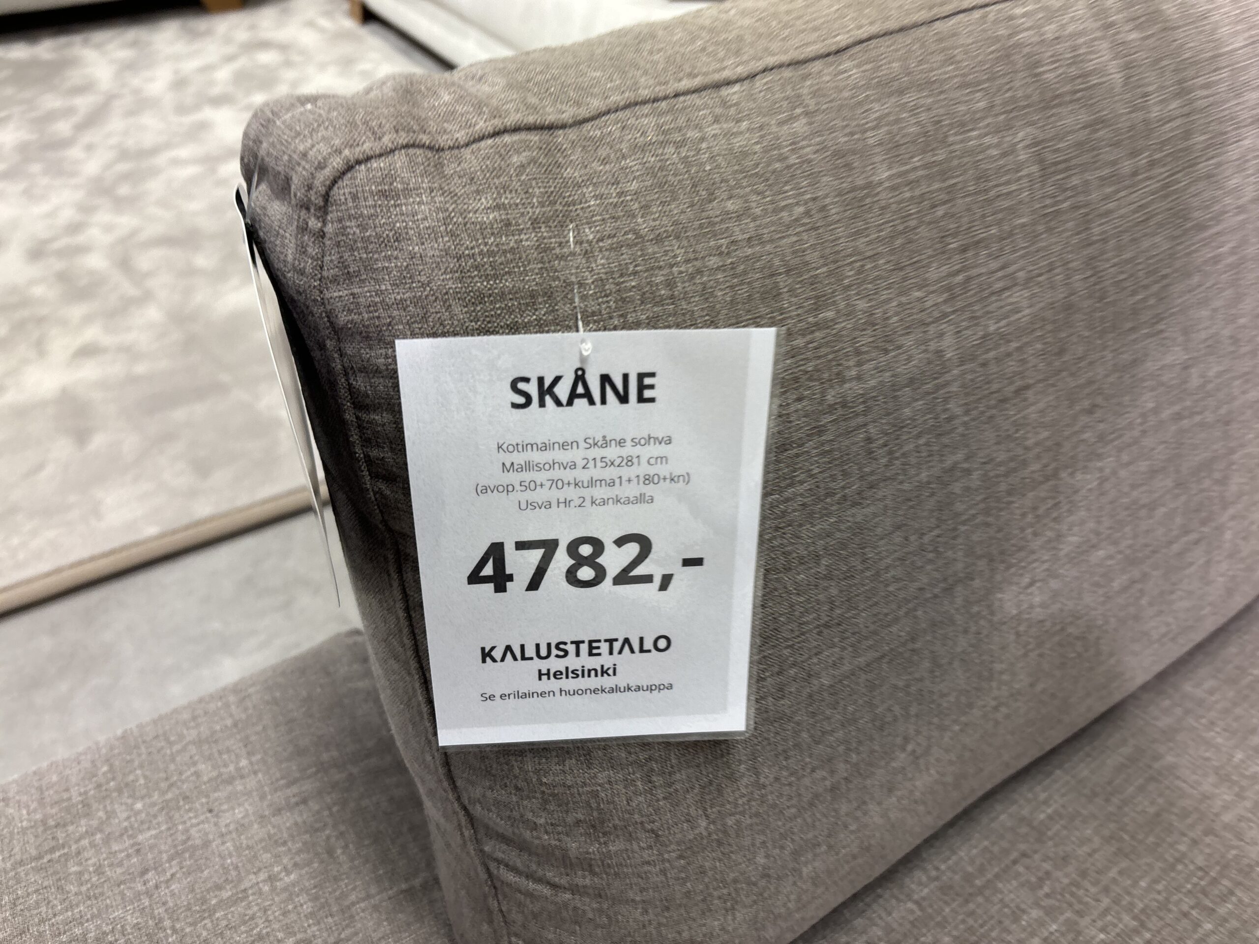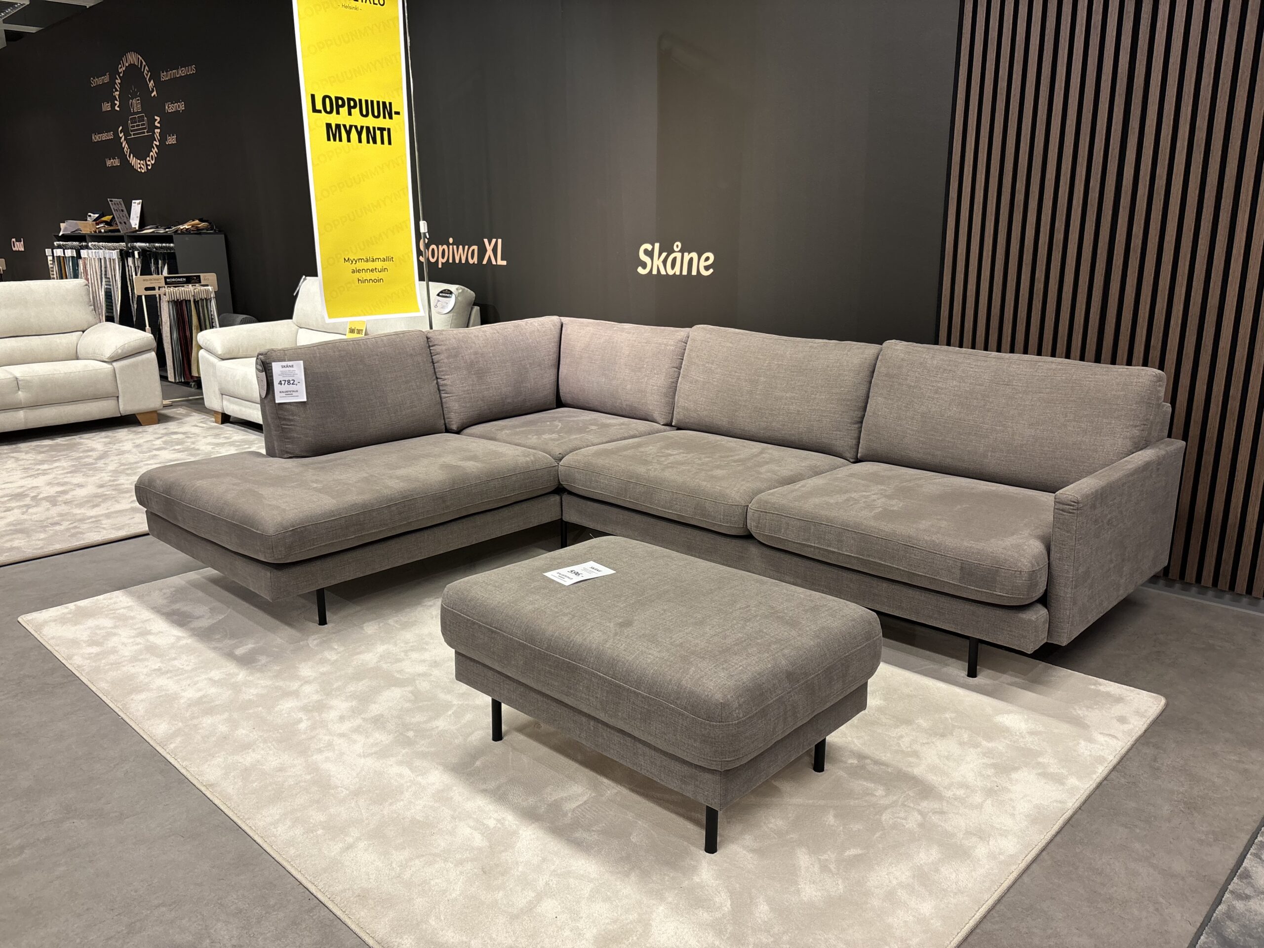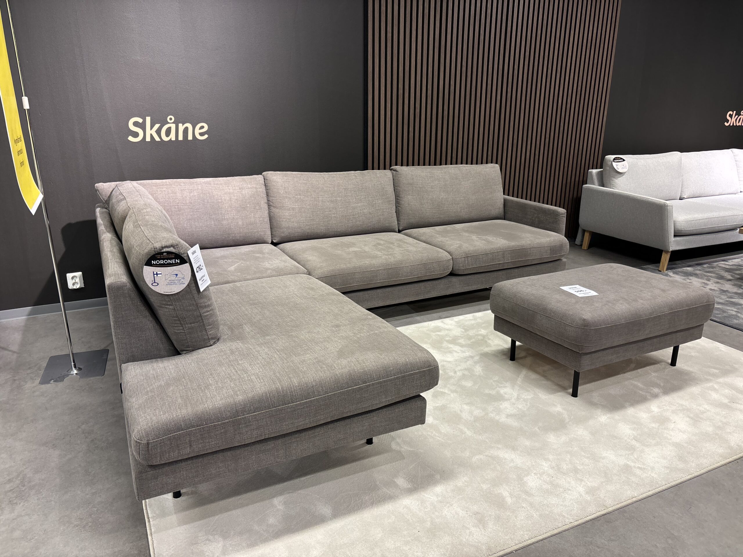 Kotimainen Skåne avokulmasohva myymälämalli verhoiltuna Usva kankaalla.